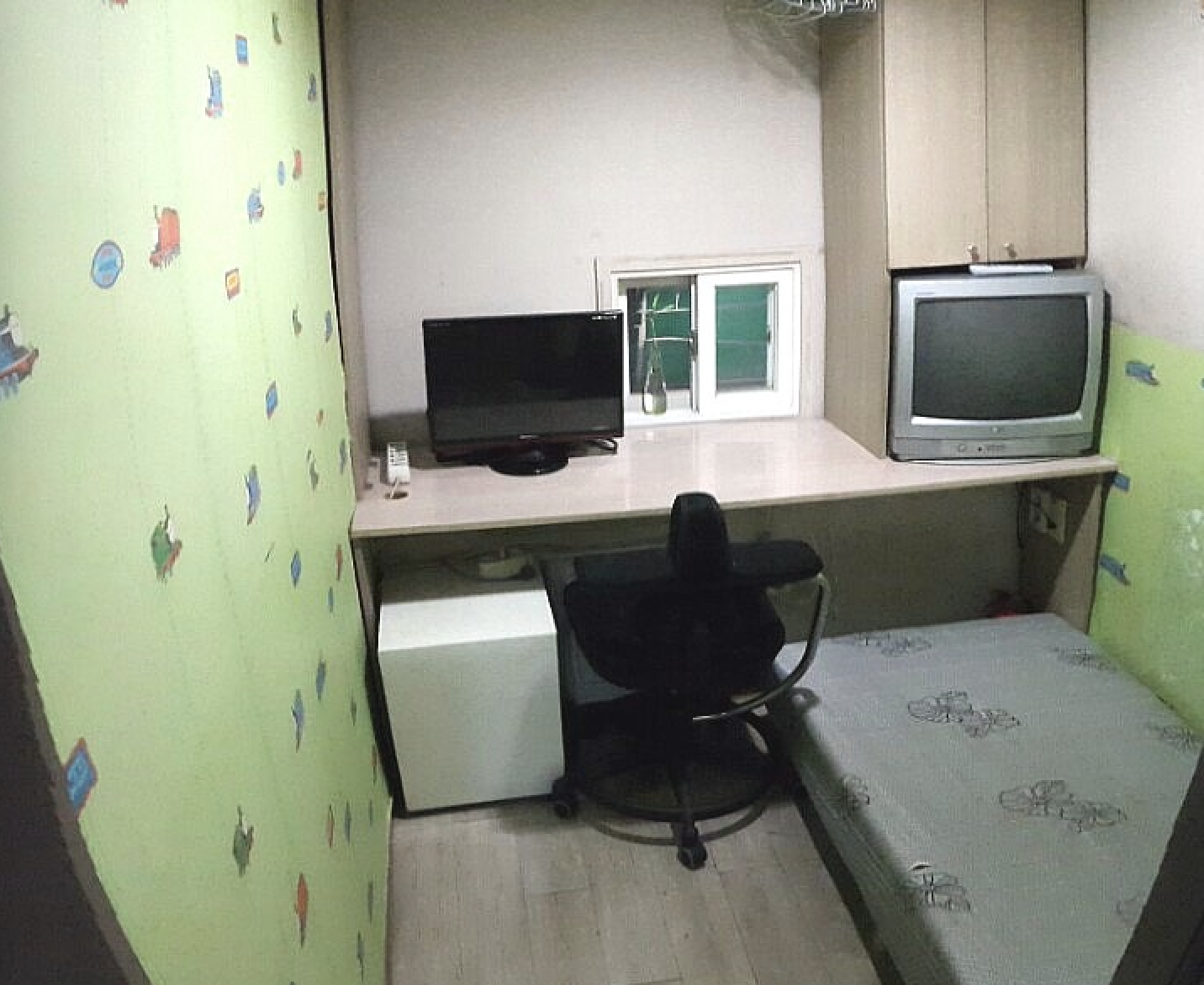 그렇게 결정한 방은 고시원 한 가운데의 창문 없는 방. 잠만 자면 되는 공간이라 생각했기에 최소한의 공간만 필요했다. 머리와 발끝이 동시에 닿았으나 몸을 뉘일 곳은 충분했다. TV도 구형이었지만 일단 나오고는 있었고, 작은 냉장고도 있었다. 옷장은 부족해서 천장에 빨래줄 같이 있는 걸 썻다. 아... 빨래는 어떻게 하지? 라는 생각은 최소한으로 돌려 입고 빨아서 입자라는 생각으로 금방 접었다.